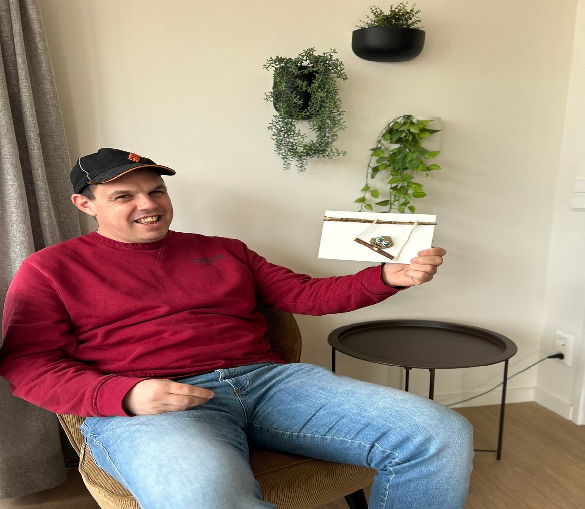 Mark vond het leuk om een vrolijk kunstwerk te maken. Vandaar dat hij ervoor heeft gekozen om een sjokkelende steen te maken. Hij heeft de stokjes en de steen zelf gezocht. Daarnaast heeft hij de houten ondergrond ook zelf gezaagd en heeft hij het kunstwerk er zelf opgeplakt.