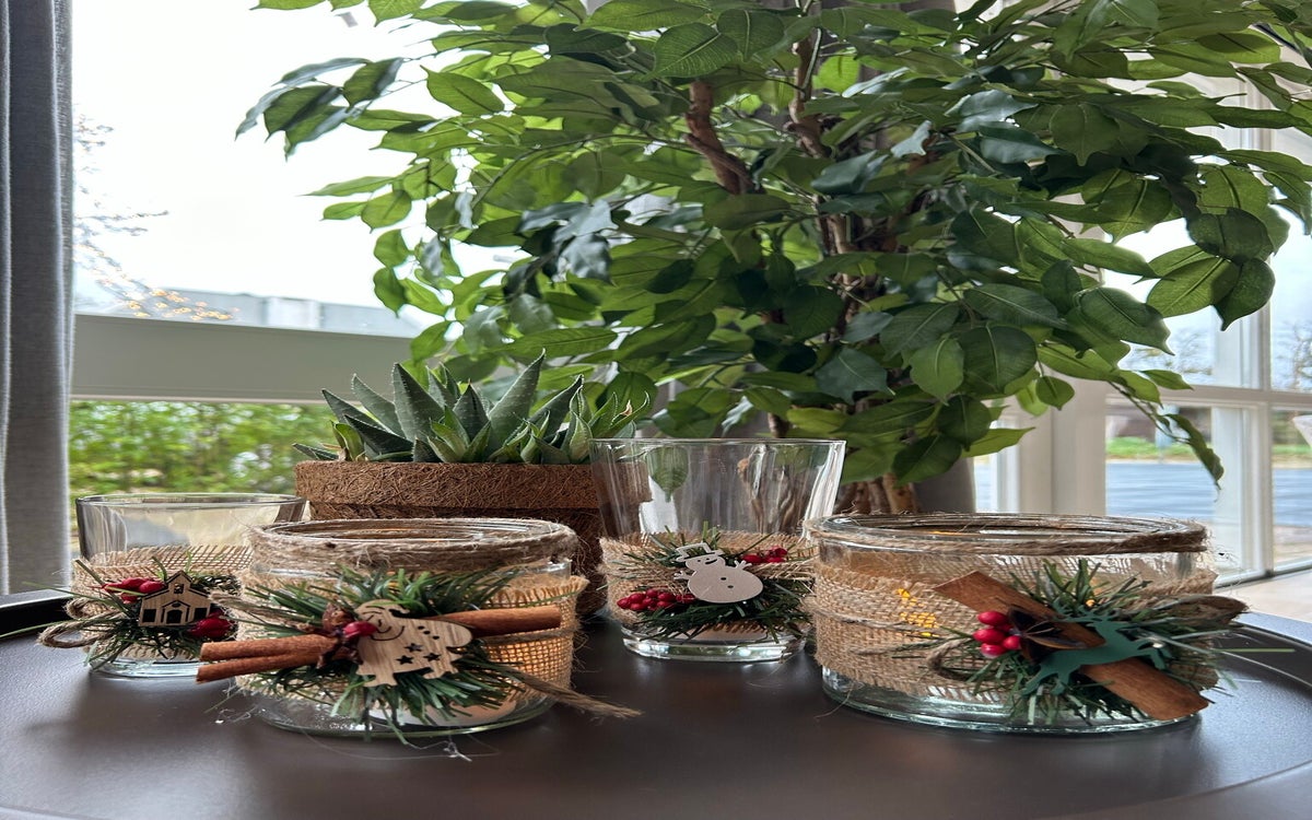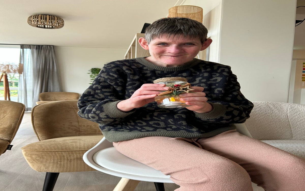 Yvonne Wijnen heeft de kaarsenhouders helpen versieren en zoals je op de foto kunt zien is ze er reuze trots op!